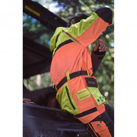 Garnitures en Kevlar® sur les avant-bras offrant une protection optimale contre les branches, les feuilles de maïs à arêtes vives et les épines lors de la marche dans des sous-bois denses. En plus des propriétés protectrices, une attention particulière a été accordée lors du développement à une respirabilité élevée. La zone du dos et les avant-bras ont été confectionnés en Nylon®, respirant, élastique et hydrofuge. Cette veste garantie une liberté de mouvement maximale et une régulation agréable de la température. Longues fermetures éclair de ventilation avec doublure en mailles respirante sous les aisselles et fermetures éclair de ventilation supplémentaires dans la zone des épaules assurant une circulation d'air optimale.